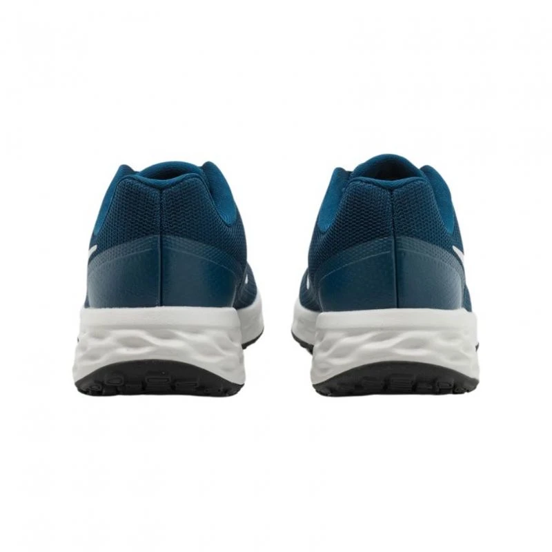 Ein weiteres wichtiges Detail des Nike Revolution 6 ist das schlichte Design mit einem minimalistischen Akzent. Die Produktdesigner von Nike haben sich dafür entschieden, im vorderen Bereich des Schuhs ein weicheres und atmungsaktiveres technisches Mesh zu verwenden, das den Knöchelbereich umhüllt und so den Komfort erhöht. Außerdem ist dieses technische Mesh mit einer Thermoversiegelung mit Ledereffekt kombiniert, vor allem im Fersenbereich, was die Widerstandsfähigkeit gegen Abnutzung und Verschleiß verstärkt. Andererseits haben diese Verstärkungen die Aufgabe, die Nähte auf ein Minimum zu reduzieren und so mögliche Scheuerstellen zu vermeiden.